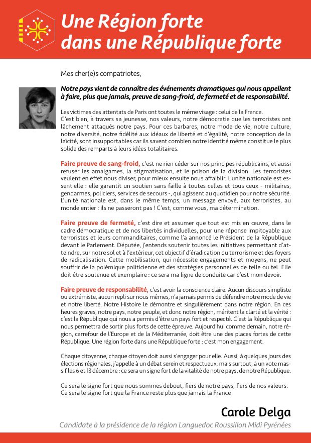 Les attentats parisiens étaient au cœur des discussions de ce rendez-vous. Au travers d’une lettre à destination des habitants de la région, la Toulousaine confirme sa volonté de rassembler. Elle appelle également les citoyens à voter en décembre prochain pour, dit-elle, démontrer « un signe fort de la vitalité de notre pays ».